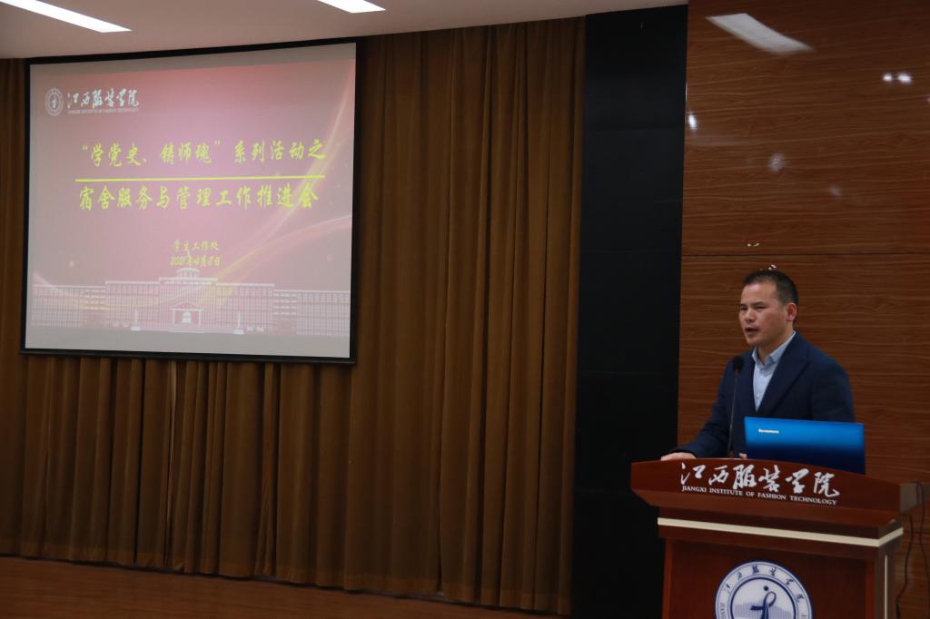 新闻中心讯(学工处供稿)为进一步提升宿舍服务水平,给学生生活和学习创造一个温馨和谐的宿舍环境,4月8日晚,我校在行政楼一楼报告厅召开“学党史,铸师魂”系列活动之2021年春季学期宿舍服务与管理工作推进会。校党委副书记唐新强、学工处处长邓良峰、学工处副处长黄朝辉、校资助中心主任余晓萍、保卫处、全体宿管员老师及宿舍楼栋学生干部代表共100余人参加了会议。会议由学工处处长邓良峰主持。