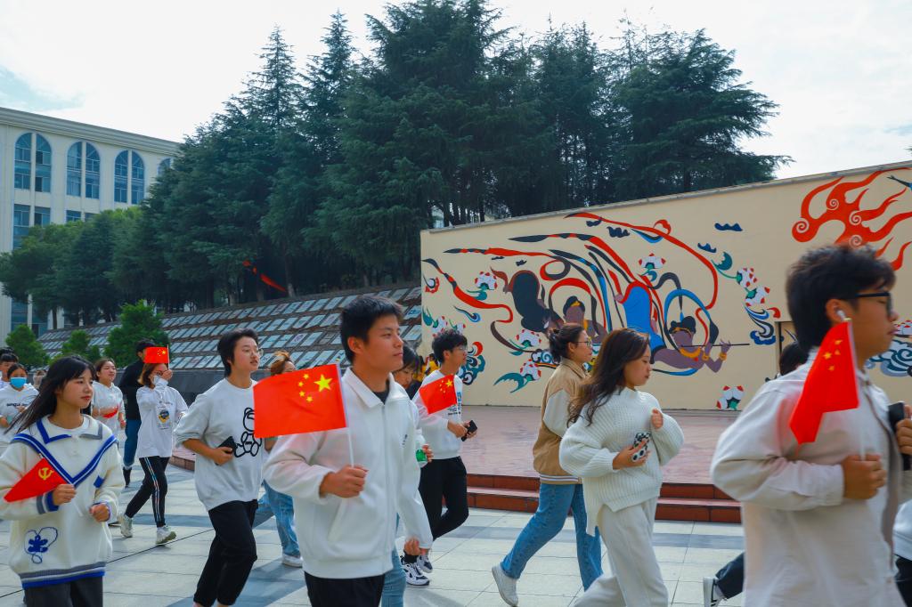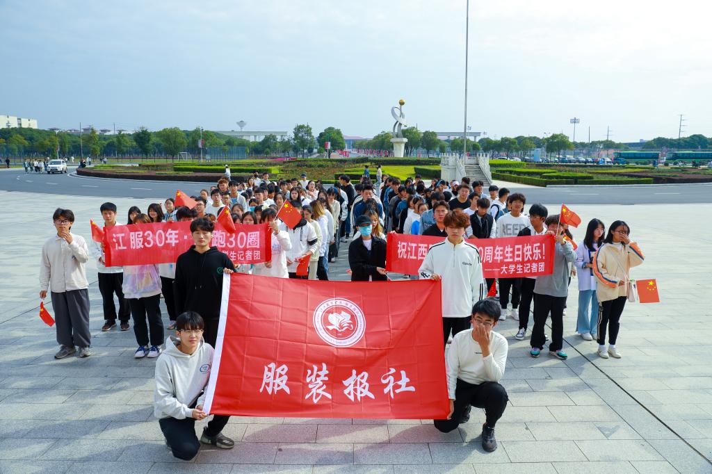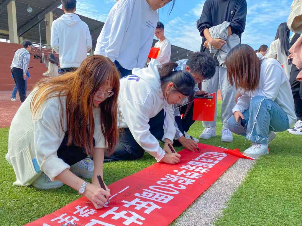 一路跑到操场,全体成员唱起了校歌《书写华章织就辉煌》。全体成员有序执笔在横幅上签写自己对学校的祝福。一笔一划、一言一行,表达了大学生记者团对江服的美好祝愿,寄托江服人的青春与梦想!我们要永远做个奔跑的少年,保持青春与朝气;我们将紧紧把握时代的主旋律,向更高更远的目标奔跑。金秋结硕果,盛世庆华诞。让我们借江服三十岁生日之际奔跑起来,喜看江服新资,载着江服光辉,与江服共前行,共同迎接江服的美好未来!