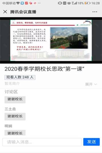 新闻中心讯:5月12日下午,我校校长陈万龙通过腾讯会议以网络直播的方式与近300名师生相聚与“云端”,以《与祖国同命运与时代共奋进》为题讲授2020年春季学期校长“思政第一课”,期待同学们在新冠肺炎疫情防控战中锻炼成长,做有担当有作为的新时代新青年。