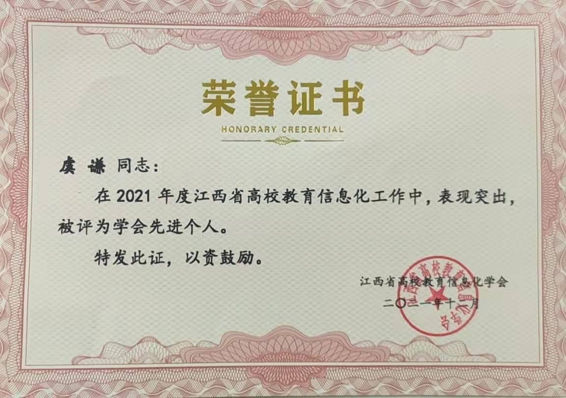 本次会议的主题是“智慧教育.应用创新”。会议结合高等教育信息化“十三五”成就与“十四五”规划,就智慧教育环境构建、数据治理与应用创新等议题进行交流研讨,分享各高校近年来所取得的经验成果与未来发展展望。会议对2021年度江西省高校信息化工作成绩突出的单位和个人进行了表彰,我校荣获“先进单位”称号,虞谦同志荣获“先进个人”称号。这不仅是对我校信息化工作的高度肯定,也为我校进一步工作提供了动力。