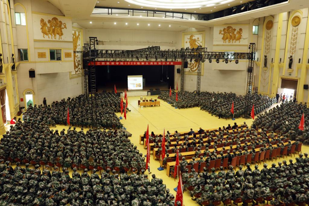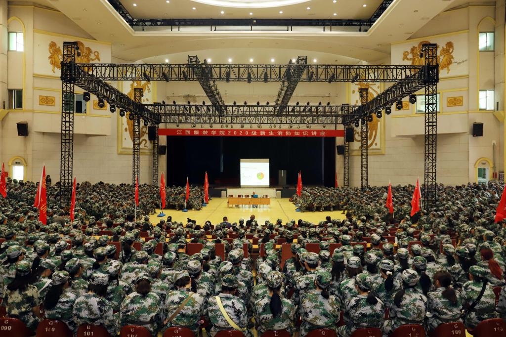 服装报讯(记者/周晨涛 摄影/万强 罗朝芳)为提高2020级新生消防意识,全面落实消防安全责任制,进一步提高我校防火、灭火和逃生的应急能力,最大限度地预防和减少各类突发公共事件造成的伤害,10月28号下午,我校特邀请南昌县消防救援大队涂良参谋在霓裳宫举行新生消防安全知识讲座。学工处处长,武装部副部长胡伟,各学院党总支(副)书记,学工办主任,全体教官、辅导员、班主任及2020级全体本科新生聆听了讲座。保卫处副处长廖小华主持讲座。