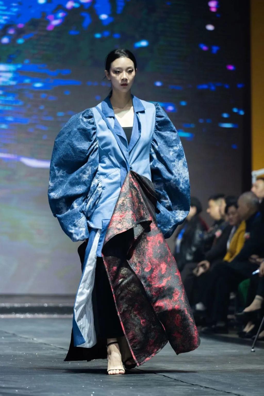 在特色鲜明的舞美和音乐陪衬下,模特们迈着优雅自信的专业步伐,展示同窗设计师们的杰作。图书馆表演厅里先进的声光电、三屏联播产生了极好的现场效果,线上线下的观众享受了一场空前盛大的视觉盛宴。