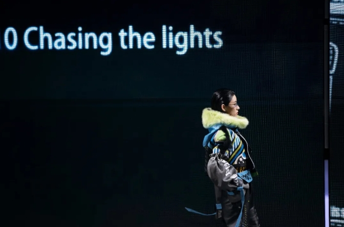 游鸿森的系列作品受赛博朋克文化的启发,他的面料全部由皮革色块拼接完成,在色彩上使用的是邻近色对比,采用的是20/21秋冬流行色电子蓝和青柠绿组合。同时,他将皮革和毛料进行不同大小和比例的分割,用直线和曲线穿插进行拼接,营造未来主义风格,用色块和硬朗的线条体现生命力,整个作品体现了赛博朋克强调的未来感和科技感。