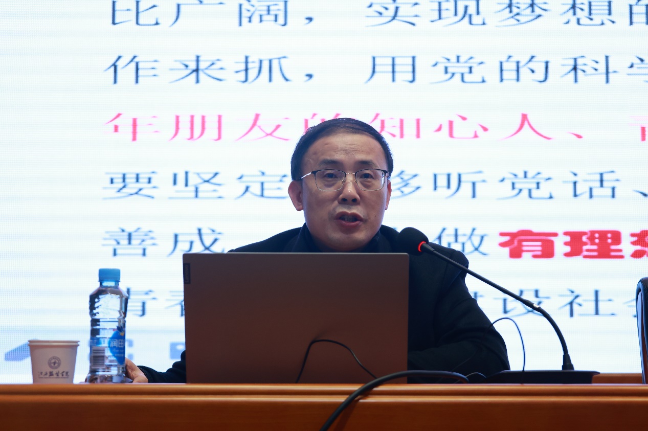 陈付龙围绕“当代中国青年生逢其时、青年强则国家强、做不负时代的青年”三个方面详细阐述了当代青年正好生逢在中华民族发展的最好时期,拥有更高质量的物质条件与精神条件,是实现中华民族伟大复兴中国梦的关键力量,每个青年都应该要抓住发展机遇,坚定理想信念,立志做有理想、敢担当、能吃苦、肯奋斗的有为青年。
