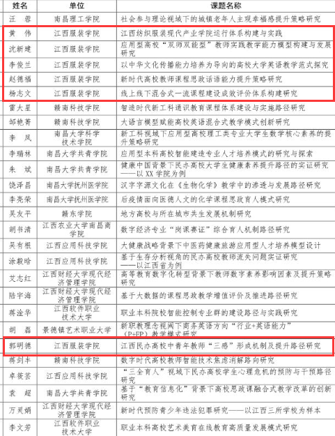 新闻中心讯 近日,江西省教育科学规划领导小组办公室公布了2023年度江西省教育科学规划课题(本科高校系列)评审结果,我校黄伟老师申报的课题《江西纺织服装现代产业学院运行体系构建与实践》、沈新建老师申报的课题《应用型高校“双师双能型”教师实践教学能力模型构建与发展研究》、李俊兰老师申报的课题《以中华文化传播能力培养为导向的高校大学英语教学范式探究》、赵德福老师申报的课题《新时代高校教师课程思政话语能力提升策略研究》、杨志文老师申报的课题《线上线下混合式一流课程建设成效评价体系构建研究》和郭明德老师申报的课题《江西民办高校中青年教师“三感”形成机制及提升路径研究》成功入选省级立项项目。