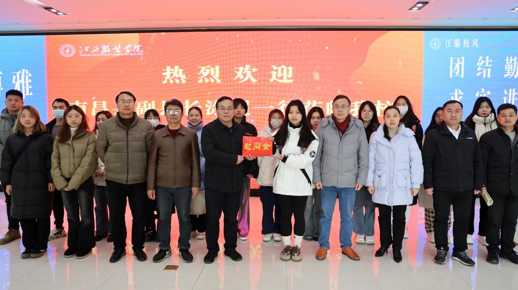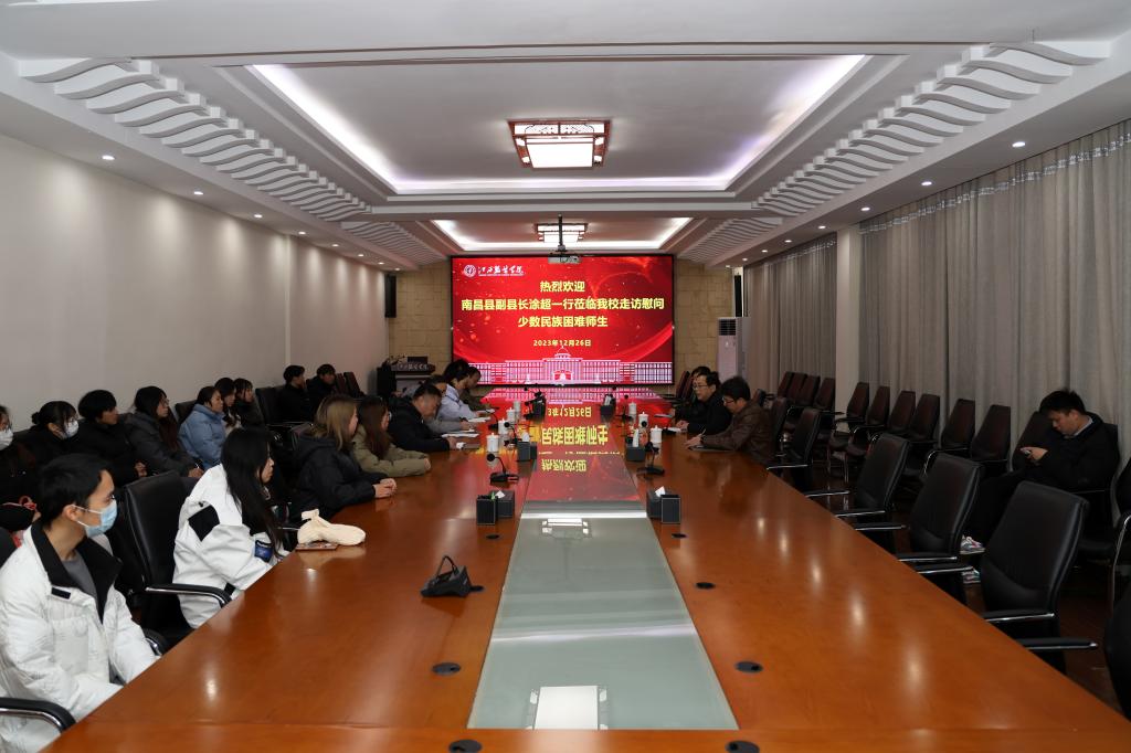 新闻中心讯(党委统战部供稿 摄影/万强)在2024年元旦到来之际,南昌县副县长涂超、南昌县委统战部副部长万荣春一行来我校看望慰问少数民族困难师生,并召开了座谈会,江西服装学院党委书记陈付龙等热情接待了涂县长一行。