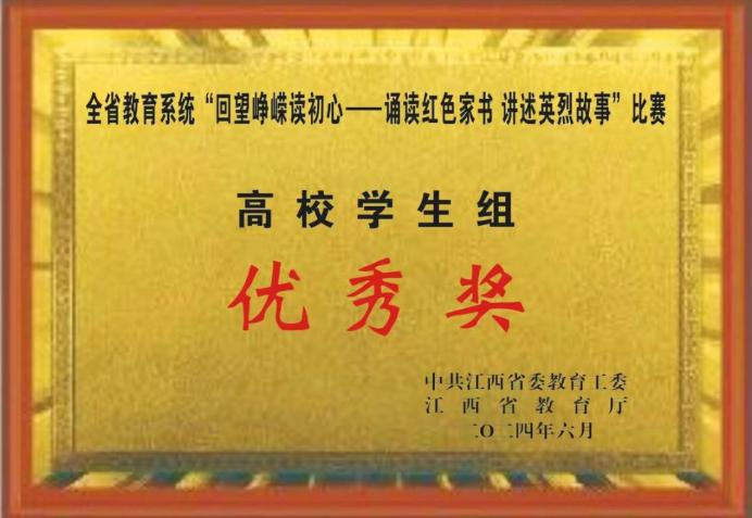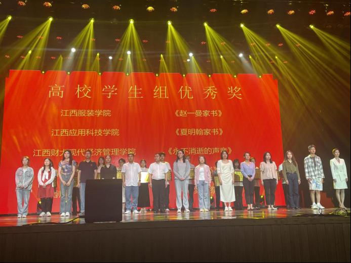 新闻中心讯(江宣) 由中共江西省委教育工委、江西省教育厅主办的2024年全省教育系统“回望峥嵘读初心——诵读红色家书,讲述英烈故事”决赛于6月1日在南昌举行。江西服装学院艺术设计学院学生高仪、刘永政的作品《一生的错过》(指导老师:陈洋安、沈新建)和时尚传媒学院学生魏子健、张钰婷的作品《赵一曼家书》(指导老师:耿渤添、杨丹)双双荣获决赛优秀奖。
