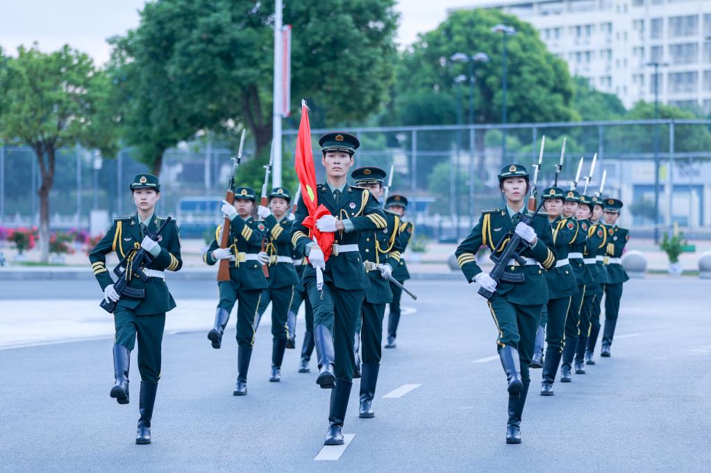随着一声嘹亮的口号划破长空,国旗护卫队步伐整齐划一、铿锵有力,护卫着鲜艳的五星红旗正步走来。