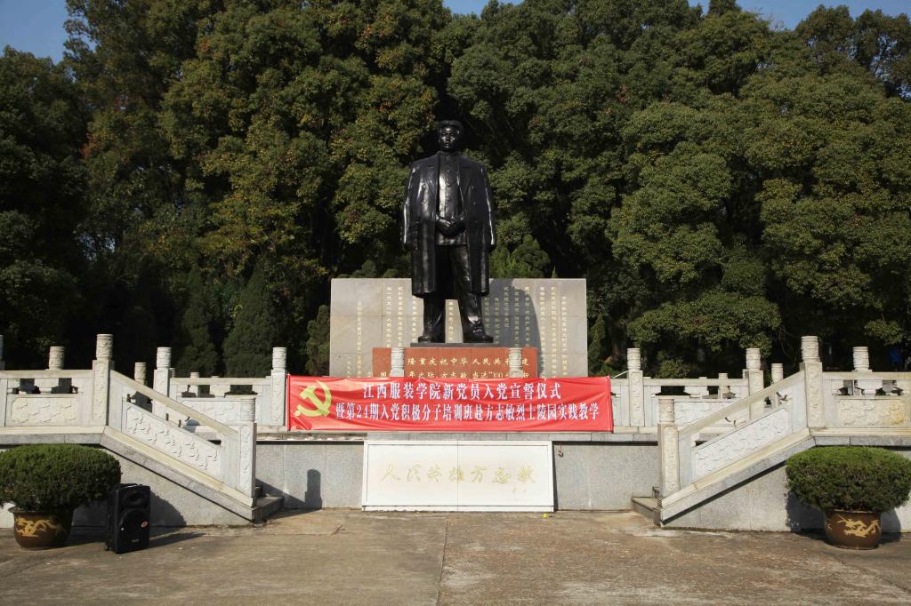 作为江西服装学院“学习十九大、学习新党章”系列教育活动的重要内容,这次实践教学活动主要围绕“雕塑广场立誓言、烈士墓前敬英烈、陈列馆中学事迹”来展开。上午八点三十分,全体成员准时乘车从学校出发前往方志敏烈士陵园。到达陵园后全体党员和入党积极分子在方志敏烈士雕像前整齐列队高唱《中华人民共和国国歌》,校国旗护卫队两名队员身着戎装作为代表向方志敏烈士塑像敬献了花圈,随后全体人员为方志敏烈士肃立默哀,新党员、时尚传媒学院14级播音本科1班叶俊伟同学为大家介绍了方志敏烈士的生平事迹和革命精神,随后60名新党员和参加活动的其他党员面向鲜红的党旗,在高副书记的带领下庄严宣誓(重温誓词),“我志愿加入中国共产党……为共产主义奋斗终身,随时准备为党和人民牺牲一切,永不叛党。”铿锵誓言久久回荡在陵园上空,告慰革命先烈的英灵,也激荡在大家的心间,表达了新老党员、师生们高举习近平新时代中国特色社会主义思想伟大旗帜,继承光荣革命传统,勇做时代先锋的坚定决心。