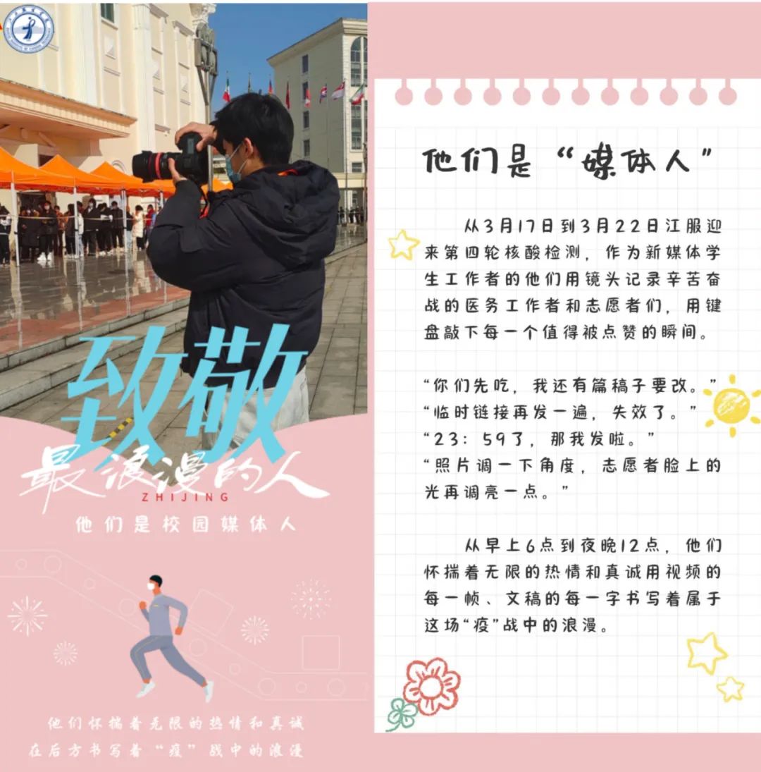 服装设计学院学子绘就了《战“疫”江服人|抗疫群英谱》,致敬每一位平凡的“英雄”;服装设计学院还开展了“疫情防控,我们有‘画说’”主题手抄报征集活动,以此传递爱心、弘扬。抗疫正能量;人文学院志愿者撰写抗疫日记,记录自己抗疫期间做志愿者的点点滴滴;服装工程学院学子用乡音为疫区送上祝福与鼓励,为南昌加油!为中国加油!