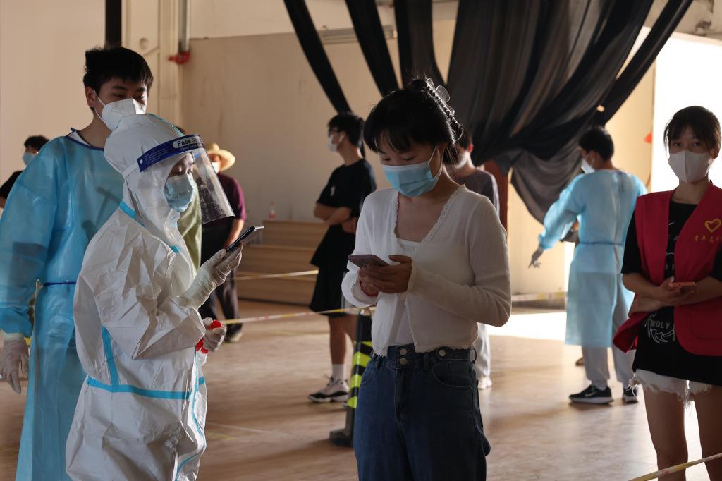 各学院党总支书记亲自上阵指挥现场,带领所有辅导员组织协调现场工作,确保检测顺利高效进行。医务人员身着防护服、戴口罩、护目镜和医用一次性手套进行核酸采样。广大教职工接到通知后立即赶赴检测现场排队进行核酸检测,学生积极配合学校有关要求,有序排队开展核酸检测。前来做核酸检测的师生自觉佩戴口罩,在工作人员及志愿者的耐心引导及帮助下,大家打开“昌通码”有序扫码提前登记好个人信息、测体温、做到一人、一码、一米有序排队,依次进行口腔咽拭子标本采样,采样结束迅速离开采样现场以保证现场流通。