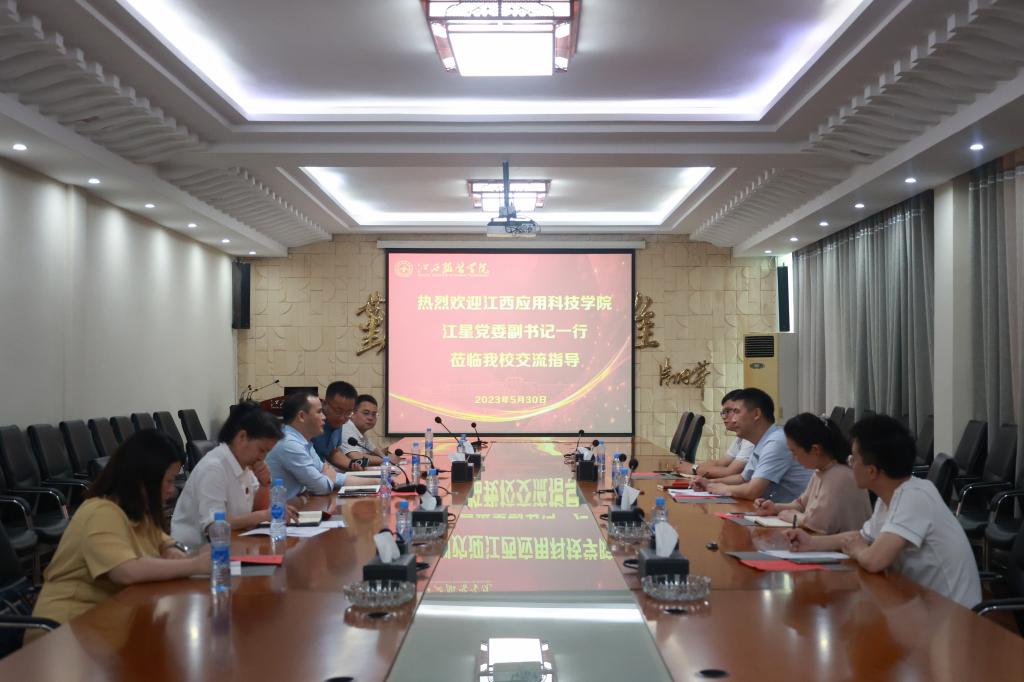新闻中心讯 为深入推进学习贯彻习近平新时代中国特色社会主义思想主题教育,深刻领会习近平总书记关于“大思政课”的重要指示精神,进一步落实立德树人根本任务,促进“大思政课”建设,协同推进思政课教学改革创新等工作,5月30日下午,江西应用科技学院党委副书记、纪委书记江星、马克思主义学院于冰雁院长一行到我校交流工作。校党委副书记唐新强、马克思主义学院院长肖杰等参加交流活动。