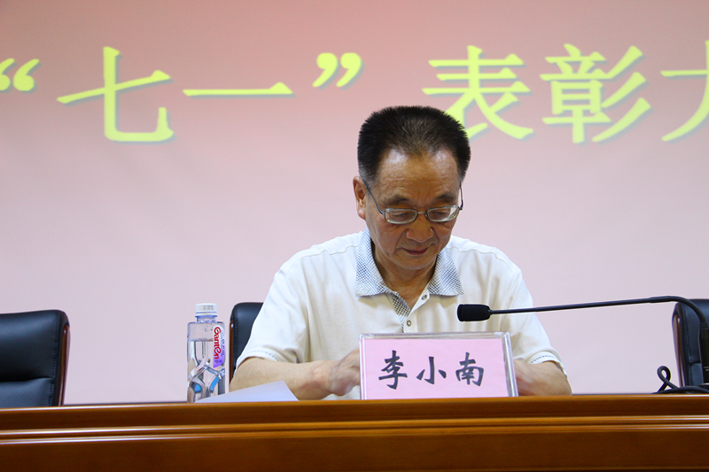 学通社讯(记者 李凡通 摄影 万强 左正鹏 徐明秋睿)为庆祝中国共产党成立94周年,表彰校内先进党组织、党建组织、先进个人,激励全校各级党组织发挥党组织的战斗堡垒作用和广大共产党员的先锋模范作用,提高我校党建工作水平,推进学校各项事业科学、和谐、稳定发展, 6月23日下午,我校在思贤楼三楼报告厅隆重举行“七·一”表彰大会。省政府督导专员、校党委书记李小南出席本次大会并作重要讲话,副理事长涂顺强、校长陈万龙等校领导出席会议,全体党员和部分入党积极分子代表参加了会议。大会由党委副书记温诒忠主持。