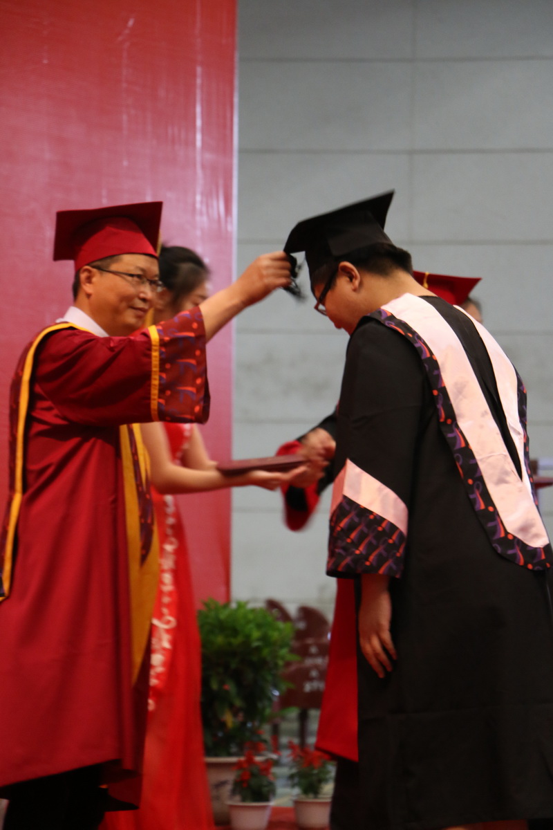 学士学位仪式在庄严的国歌声中拉开帷幕,陈副校长宣读学士学位授予决定后,校学位评定委员会主席、副主席为毕业生颁授学位证书并拨苏正冠。