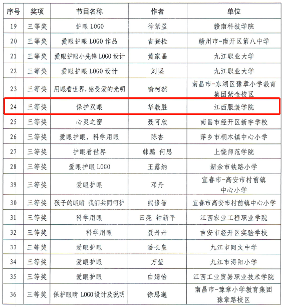 新闻中心讯 为深入贯彻习近平总书记关于儿童青少年近视问题的重要指示精神,全面落实教育部等八部门《综合防控儿童青少年近视实施方案》,进一步营造近视防控宣传教育氛围,根据《关于开展爱眼护眼公益宣传作品征集的通知》(赣教体艺字[2021]11号)安排,省教育厅、省卫生健康委员会开展了爱眼护眼公益宣传作品征集活动。我校师生作品在本次活动中获佳绩,其中张龙颖的作品《关爱视力健康》荣获海报类一等奖,牛壮壮、刘清华的作品《扬帆赣江》荣获LOGO类作品一等奖,华教胜的作品《保护双眼》荣获LOGO类作品三等奖。