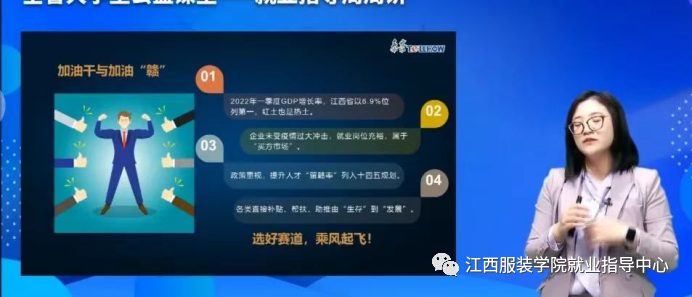 新闻中心讯(供稿/就业办陈康康)为找到疫情防控常态化形势下大学生求职的破局之道,培育正确的当代大学生职业生涯规划,2022年4月29日晚,由江西省教育厅主办,面向全省大学生的线上公益课堂——就业指导周周讲在线上准时开课。江西服装学院积极响应江西省教育厅号召,我校就业办李玲副主任组织部分在校学生在主教楼一110进行观看,各分院以线上形式进行共同学习,本次全省大学生公益课我校师生参与观看人数达5200人。