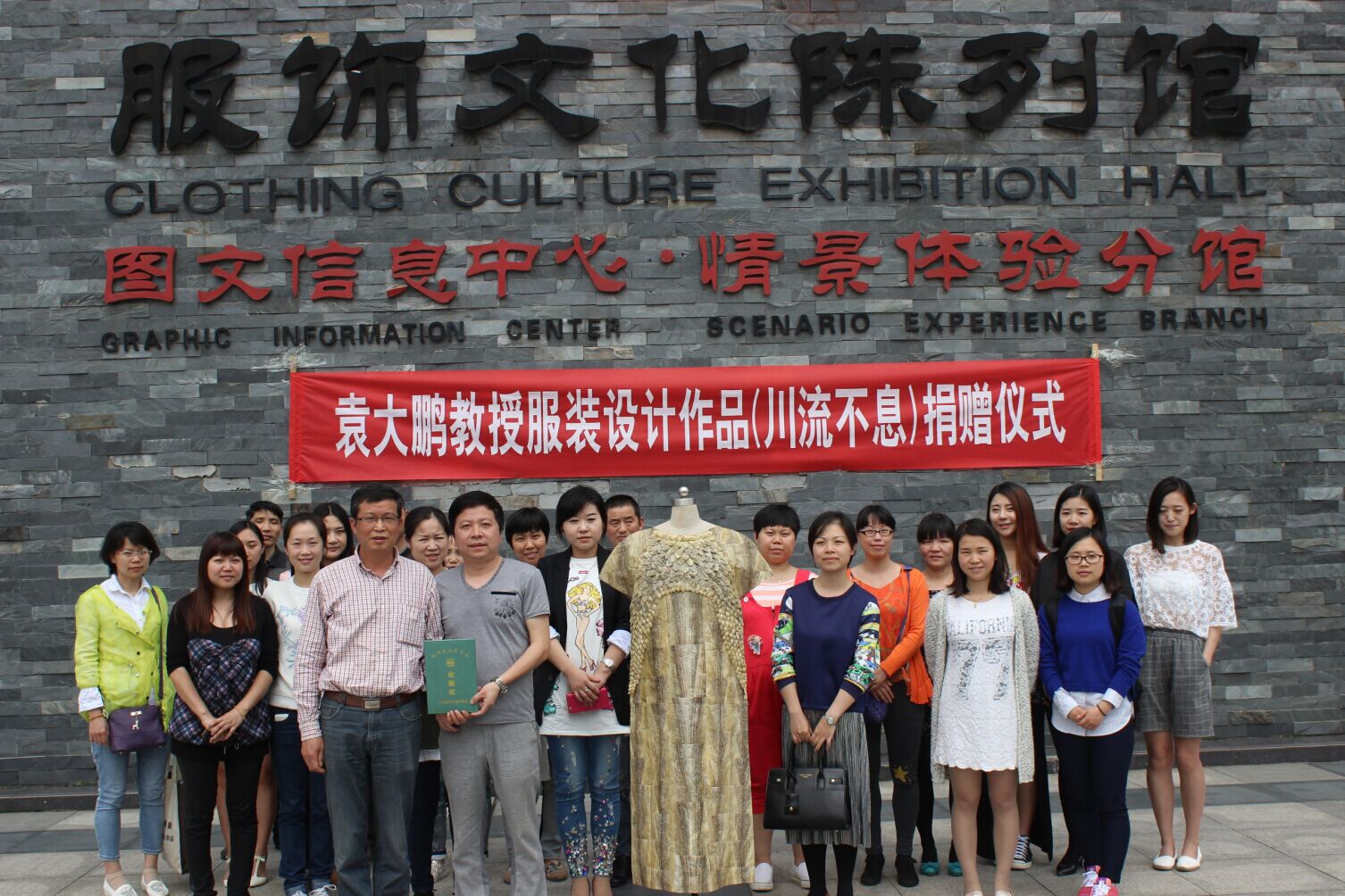 学通社讯(万强) 5月5日下午,武汉纺织大学服装学院副院长、硕士研究生导师袁大鹏教授将其服装设计作品《川流不息、渊澄取映》捐赠我校。校长陈万龙、服饰文化陈列馆馆长赵子建、服装设计与管理分院院长段婷及部分学生代表参加了捐赠仪式。