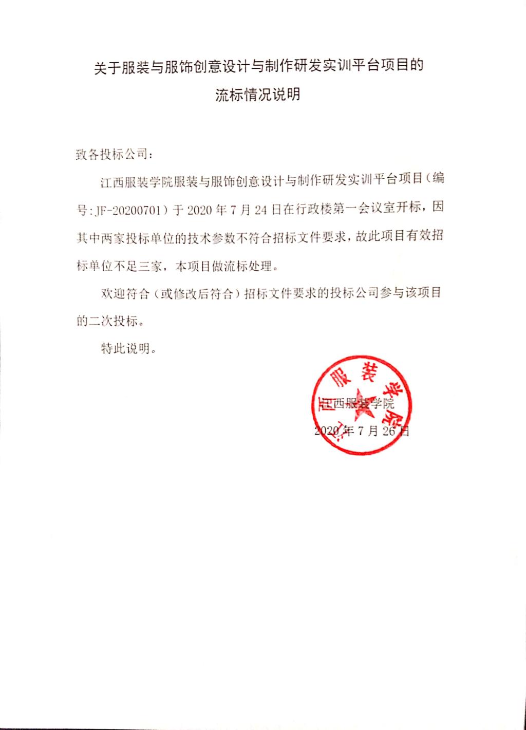 关于服装与服饰创意设计与制作研发实训平台项目的流标情况说明