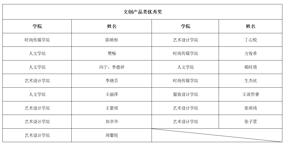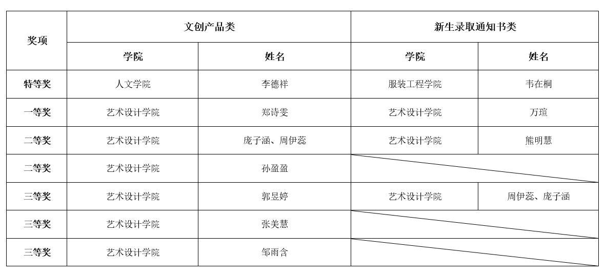 经大赛评审小组评审,评选出文创产品类:特等奖1个,一等奖1个,二等奖2个,三等奖3个,优秀奖15个;新生录取通知书类:特等奖1个,一等奖1个,二等奖1个,三等奖1个;现将获奖名单予以公示。