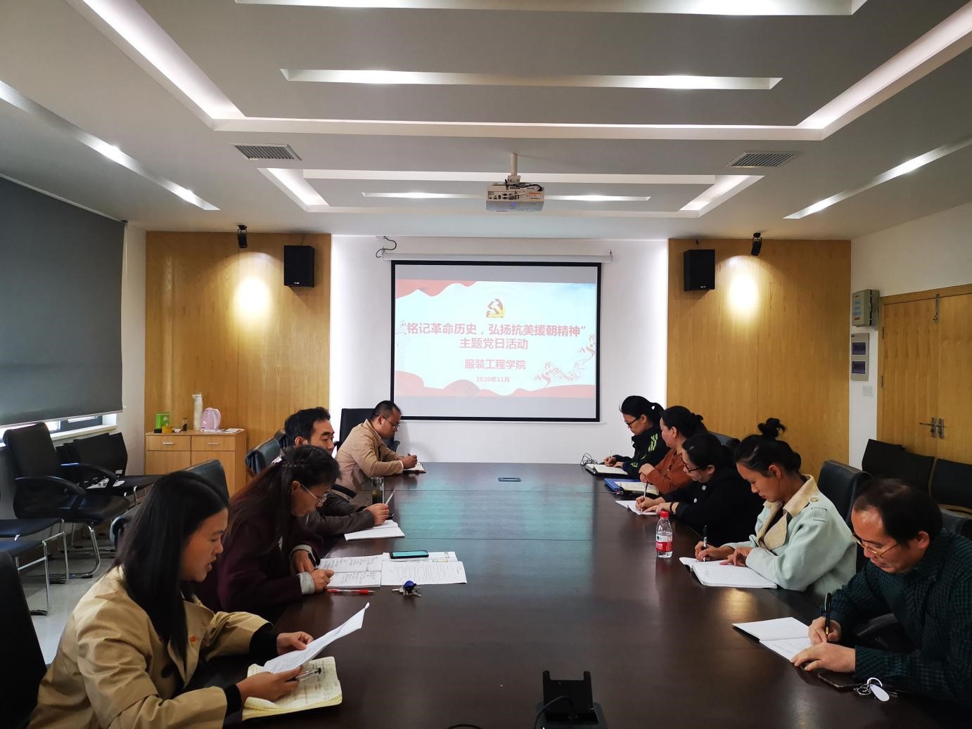 为深入贯彻学习习近平总书记在纪念中国人民志愿军抗美援朝出国作战70周年大会上重要讲话精神,加强爱国主义教育,弘扬抗美援朝精神。11月10日,服装工程学院党总支组织开展了“铭记革命历史使命,弘扬抗美援朝精神”主题党日活动。