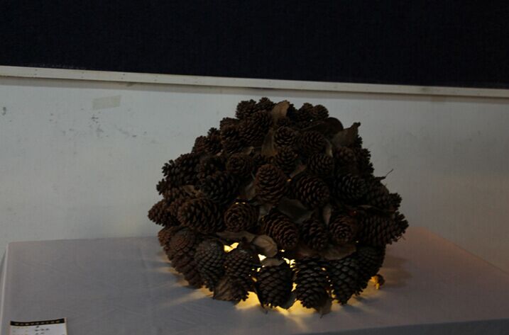 《裹》以松果为主材,利用松果的质感和颜色表达一种落败感,里面加入灯泡,利用光感形成对比。表达着保持自我,感染周围,即使是失败,但失败之中也可以看到成功的希望与光明。