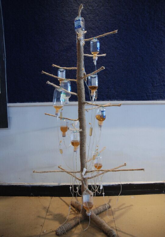 展上,一颗挂满了输液瓶的残喘之树让大家眼前一亮,“我起先的创意就是一颗铁树,当我看到一个关于环境的公益广告时我来了这个灵感。我想通过这个作品告诉大家‘保护环境,人人有责’。”作者孟宏杰说。