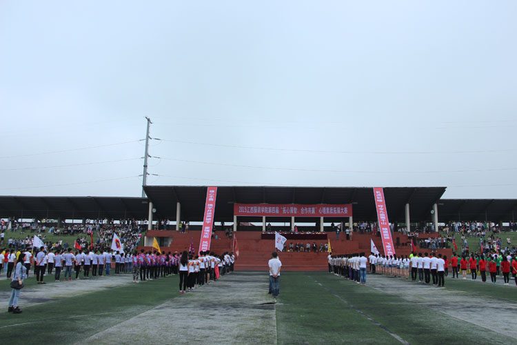 学通社讯(记者/高天家  摄影/左正鹏) 为了提高同学们的心理素质,加强同学间的沟通交流,5月17日,以“拓心展智、合作共赢”为主题的第四届心理素质拓展大赛在运动场举行。各分院(部)及学生会、社团联合会等14支参赛代表队参加了比赛。校党委副书记高建国出席了开幕式。