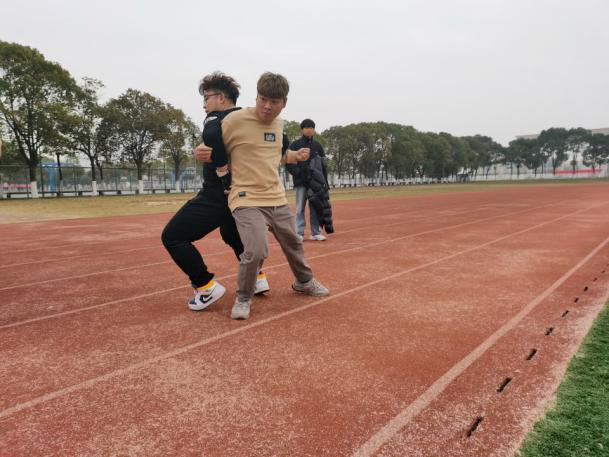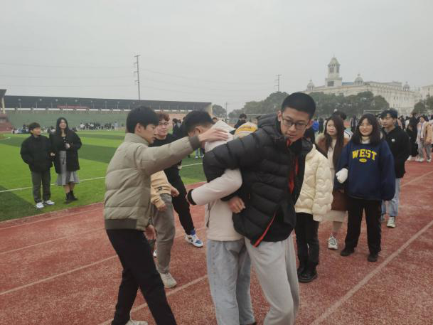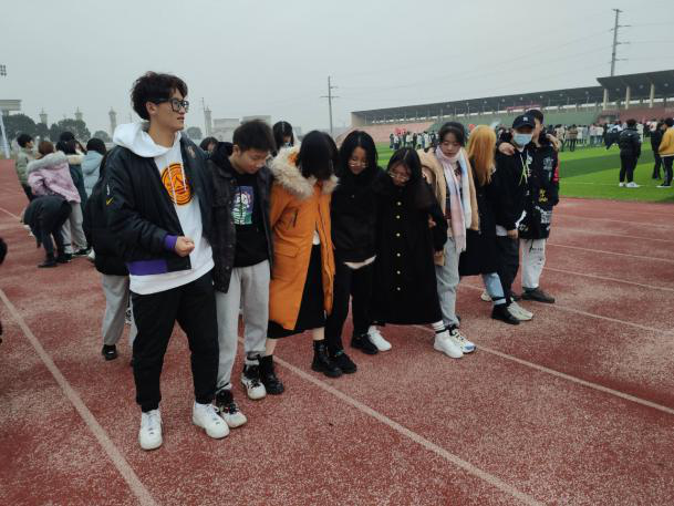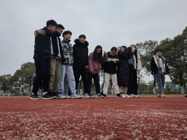 在寒凉的冷风中,每个人都跃跃欲试的开始操练,黑色的绷带,像一双双恶作剧的手,将每个人捆绑在一起,绳子虽然束缚了双脚,限制了行动,但无法成为团结向前的枷锁,队员们,相互抱肩,紧握着双手,众志成城,齐步向前,充分的体现出了他们团结的精神和克服困难的勇气。