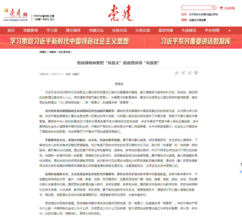 新闻中心讯(供稿/马克思主义学院)12月13日,中共中央宣传部主管、《党建》杂志社主办的党建网刊发我校马克思主义学院吴雄生副教授撰写的理论文章《思政课教师要把“有意义”的道理讲得“有意思”》。这是马院老师深入学习贯彻党的二十届三中全会精神和全国教育大会精神的持续行动。