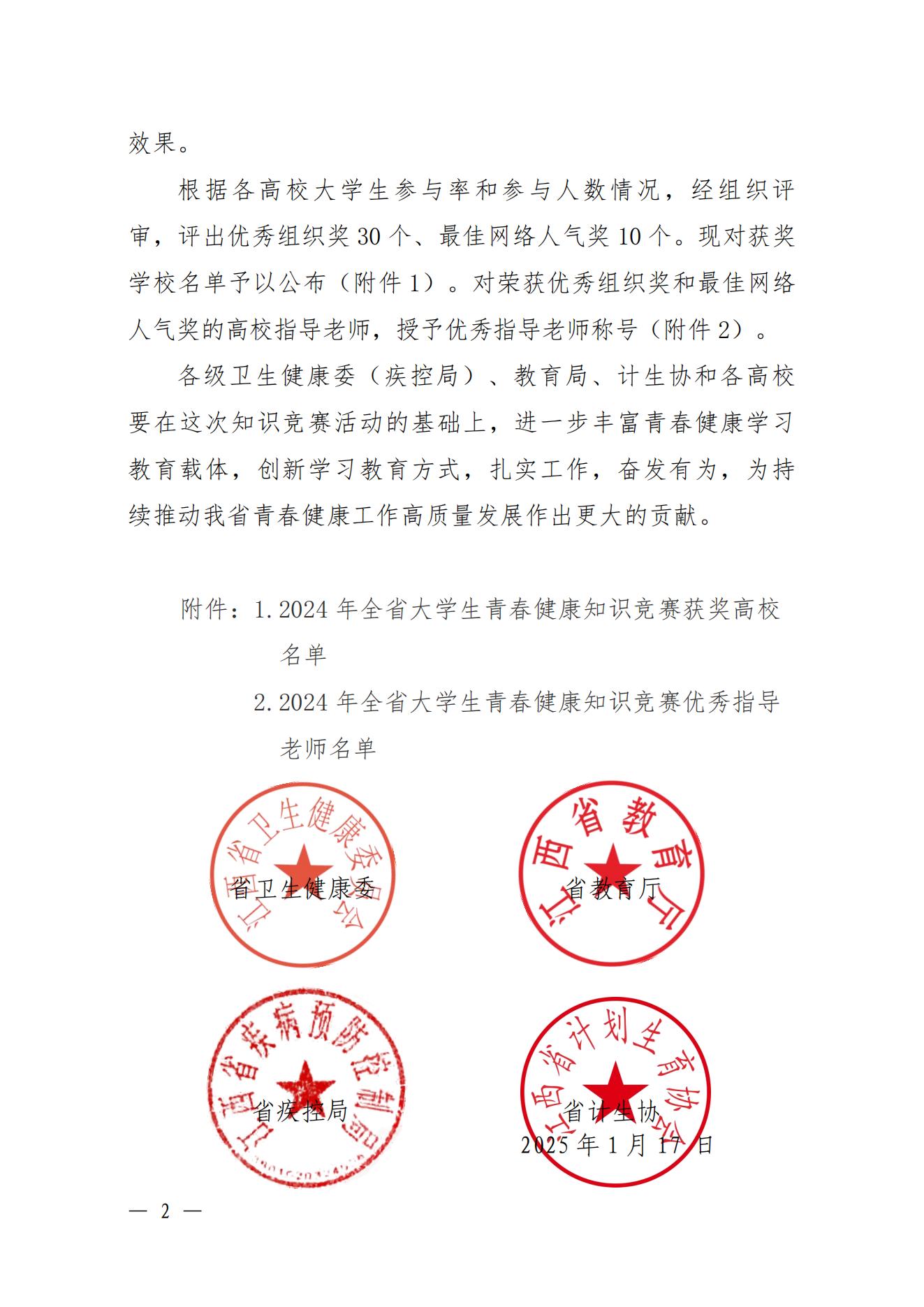 新闻中心讯(供稿/ 校团委)近日,由江西省卫生健康委员会、江西省教育厅、江西省疾病预防控制局和江西省计划生育协会联合主办全省大学生青春健康知识竞赛公布获奖名单,我校荣获最佳组织奖,最佳人气奖,团委王姗姗老师荣获优秀指导教师奖。