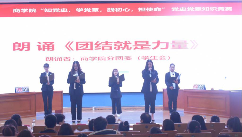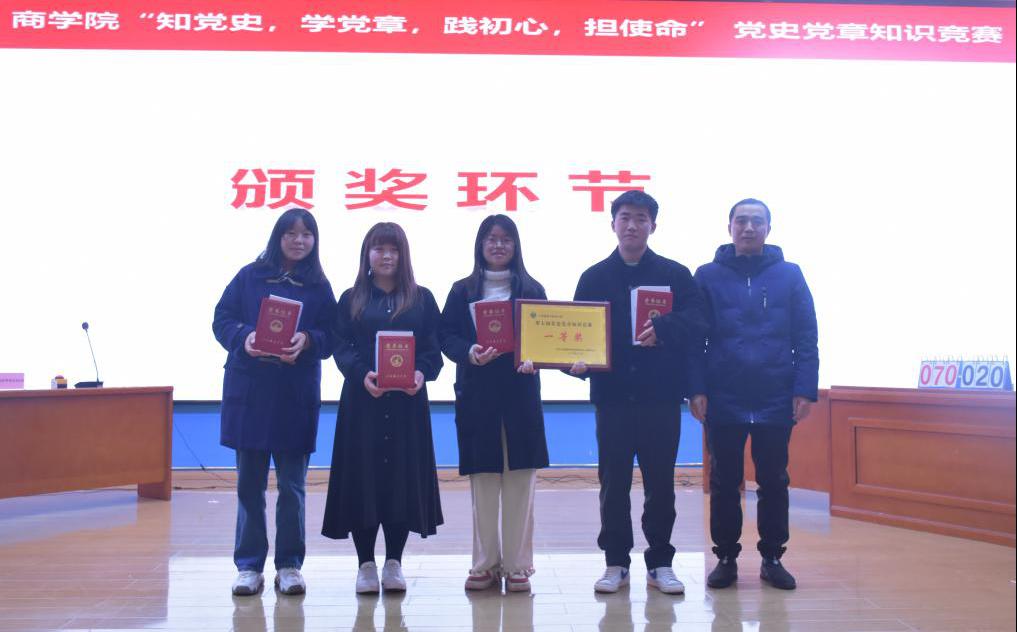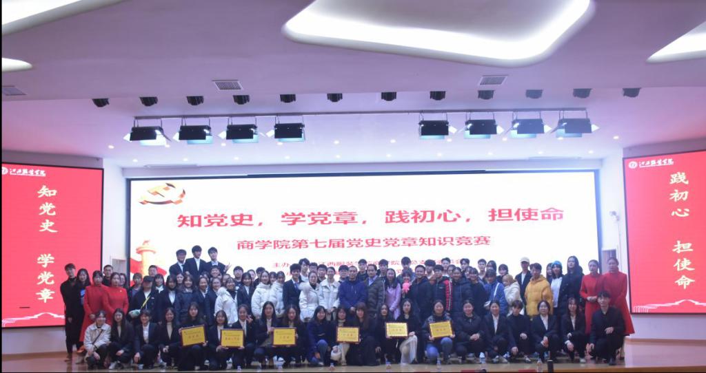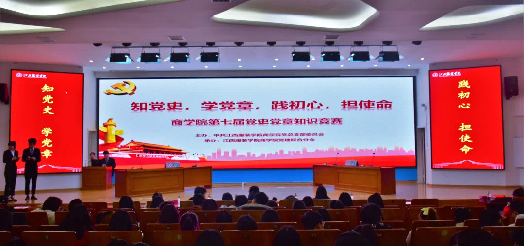 为纪念中国共产党成立99周年,重温中国共产党光辉历程,厚植爱党、爱国情怀,进一步激发青年大学生学习党史党章的热情。2020年12月10日晚18:30,江西服装学院商学院在思贤楼报告厅举行“知党史,学党章,践初心,担使命”第七届党史党章知识竞赛。莅临比赛现场的领导老师有商学院党总支书记黄晶磊书记、商学院学生党支部书记欧阳耀诚书记以及商学院全体辅导员,20级全体新生参与,本次大赛由廖佳敏、何夏伟主持。