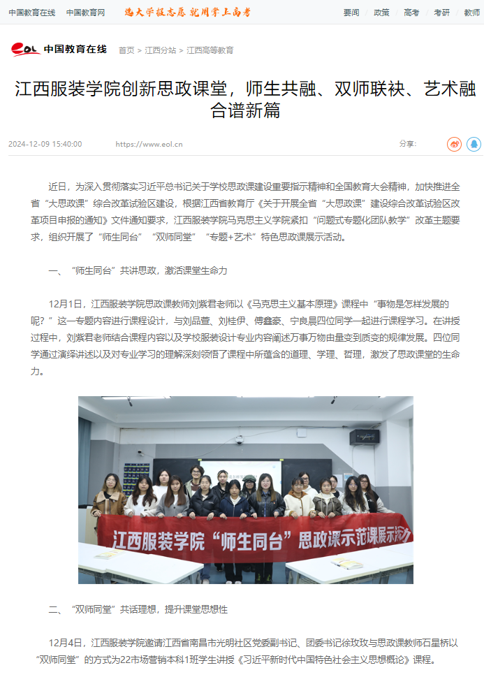 中国教育在线:江西服装学院创新思政课堂,师生共融、双师联袂、艺术融合谱新篇