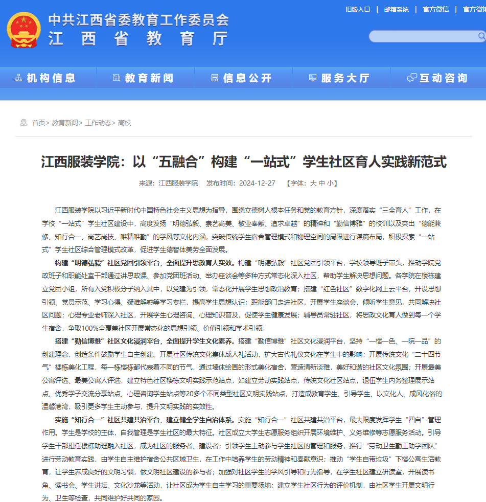 江西省教育厅官网:江西服装学院:以“五融合”构建“一站式”学生社区育人实践新范式