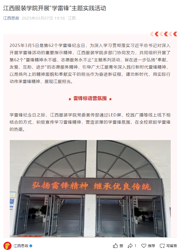 2025年3月5日是第62个学雷锋纪念日,为深入学习贯彻落实习近平总书记对深入开展学雷锋活动的重要指示精神,江西服装学院多部门协同发力,共同组织开展了第62个"雷锋精神永不褪,志愿服务永不止"主题系列活动,旨在进一步弘扬"奉献、友爱、互助、进步"的志愿服务精神,引导广大江服青年深入践行新时代雷锋精神,以昂扬向上的精神面貌和奉献实干的担当作为奋进新征程、建功新时代,用实际行动传承雷锋精神,展现江服担当。