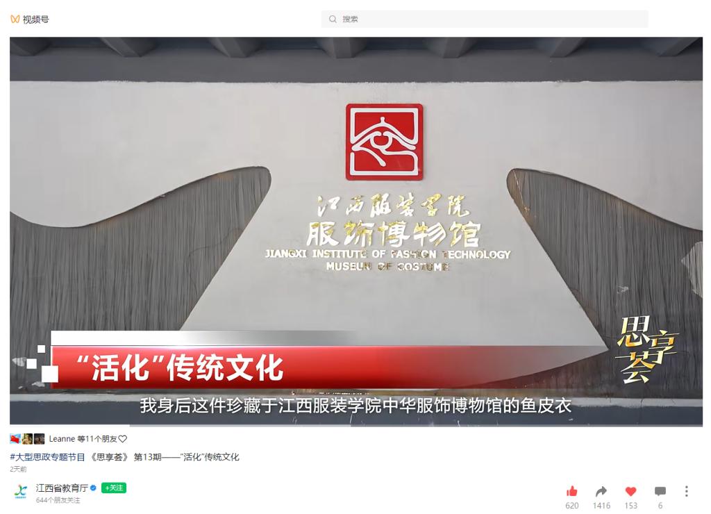 3月15日,江西省教育厅推出大型思政专题节目《思享荟》第13期——“活化”传统文化,报道我校“中华服饰博物馆”在弘扬和传承中华服饰优秀文化上发挥的积极作用,通过传承和弘扬中华优秀传统文化,不断提高公众的文化认同和文化自信,让传统文化在历史发展的长河中绽放绚丽之花,共绘人类文明壮丽画卷。