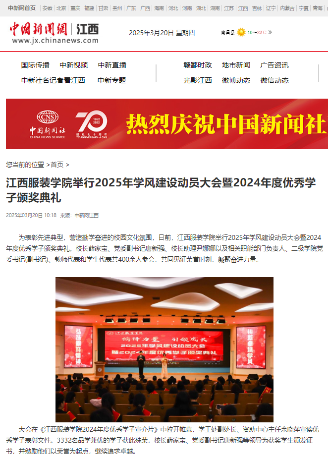 中国新闻网:江西服装学院举行2025年学风建设动员大会暨2024年度优秀学子颁奖典礼