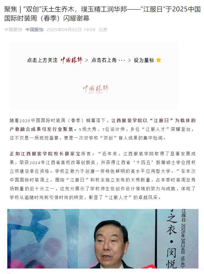 中国服饰:聚焦|“双创”沃土生乔木,璞玉精工润华邦——“江服日”于2025中国国际时装周(春季)闪耀谢幕