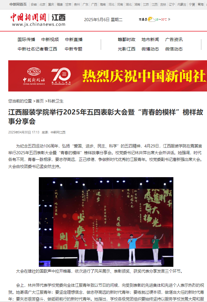 中国新闻网:江西服装学院举行2025年五四表彰大会暨“青春的模样”榜样故事分享会