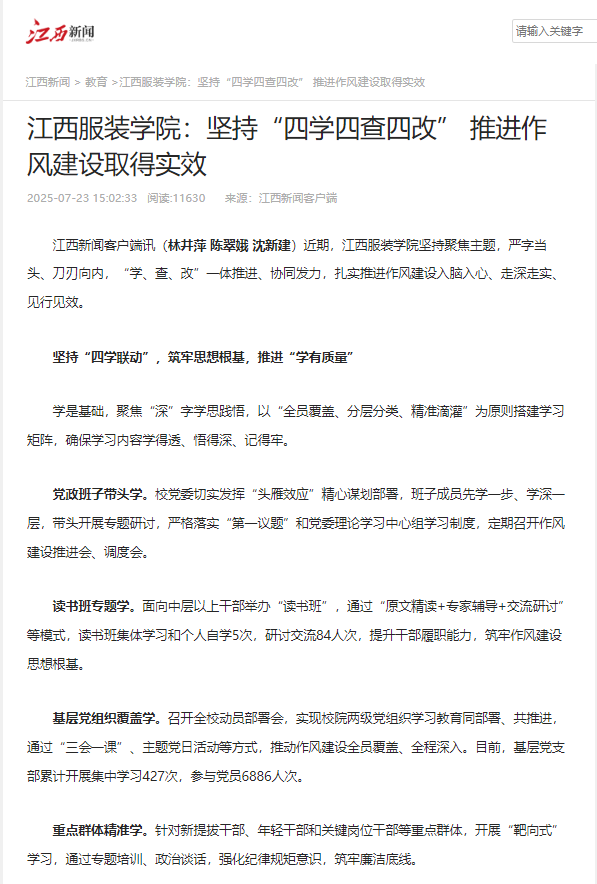 江西新闻:江西服装学院:坚持“四学四查四改” 推进作风建设取得实效