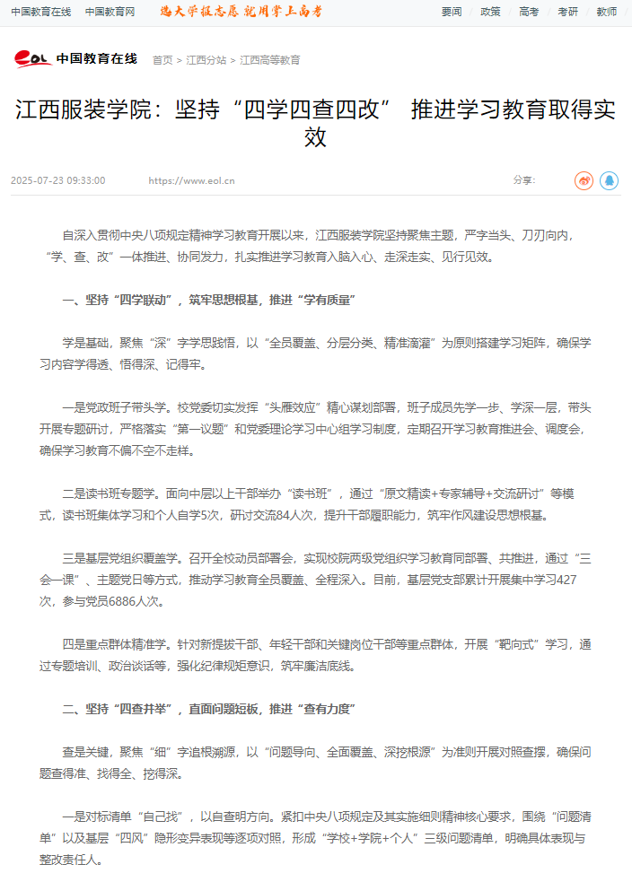 中国教育在线:江西服装学院:坚持“四学四查四改” 推进学习教育取得实效