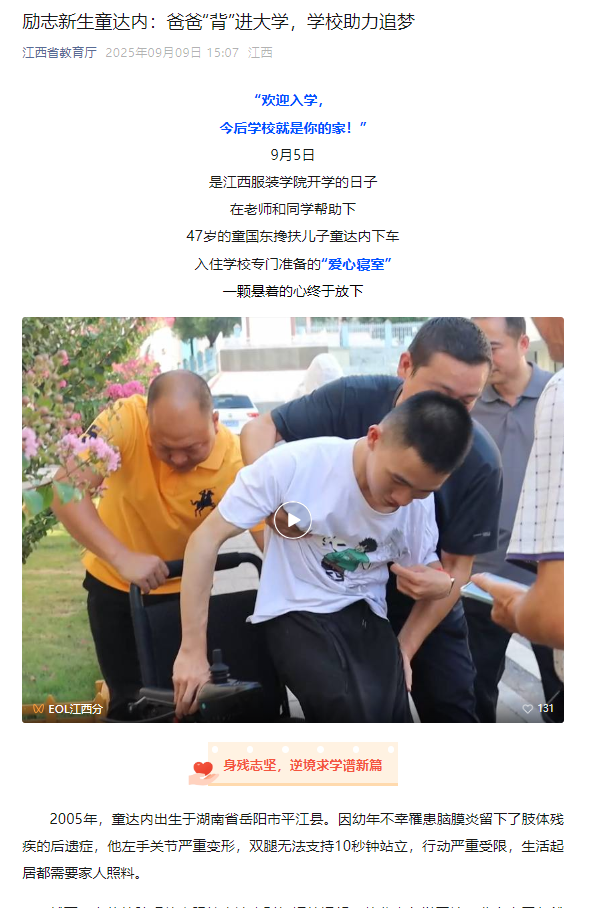 原文链接:江西省教育厅:励志新生童达内:爸爸“背”进大学,学校助力追梦