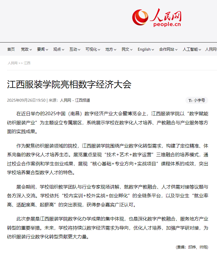 在近日举办的2025中国(南昌)数字经济产业大会暨博览会上,江西服装学院以“数字赋能纺织服装产业”为主题设立专属展区,系统展示学校在数字化人才培养、产教融合与产业服务等方面的实践成果。