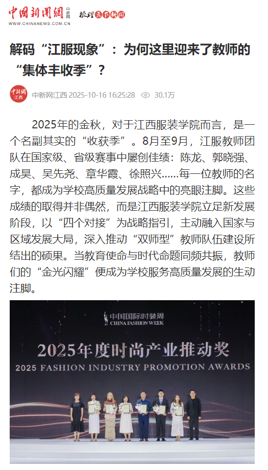 2025年的金秋,对于江西服装学院而言,是一个名副其实的“收获季”。8月至9月,江服教师团队在国家级、省级赛事中屡创佳绩:陈龙、郭晓强、成昊、吴先尧、章华霞、徐照兴……每一位教师的名字,都成为学校高质量发展战略中的亮眼注脚。这些成绩的取得并非偶然,而是江西服装学院立足新发展阶段,以“四个对接”为战略指引,主动融入国家与区域发展大局,深入推动“双师型”教师队伍建设所结出的硕果。当教育使命与时代命题同频共振,教师们的“金光闪耀”便成为学校服务高质量发展的生动注脚。