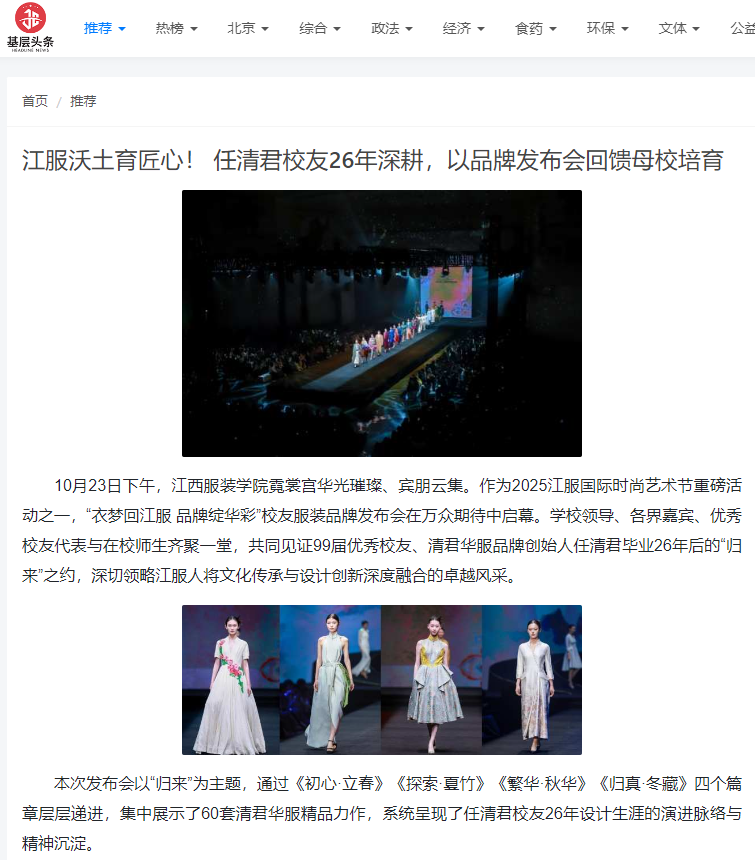 10月23日下午,江西服装学院霓裳宫华光璀璨、宾朋云集。作为2025江服国际时尚艺术节重磅活动之一,“衣梦回江服 品牌绽华彩”校友服装品牌发布会在万众期待中启幕。学校领导、各界嘉宾、优秀校友代表与在校师生齐聚一堂,共同见证99届优秀校友、清君华服品牌创始人任清君毕业26年后的“归来”之约,深切领略江服人将文化传承与设计创新深度融合的卓越风采。