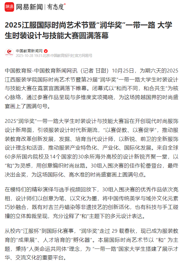 中国教育新闻网:2025江服国际时尚艺术节暨“润华奖”一带一路 大学生时装设计与技能大赛圆满落幕
