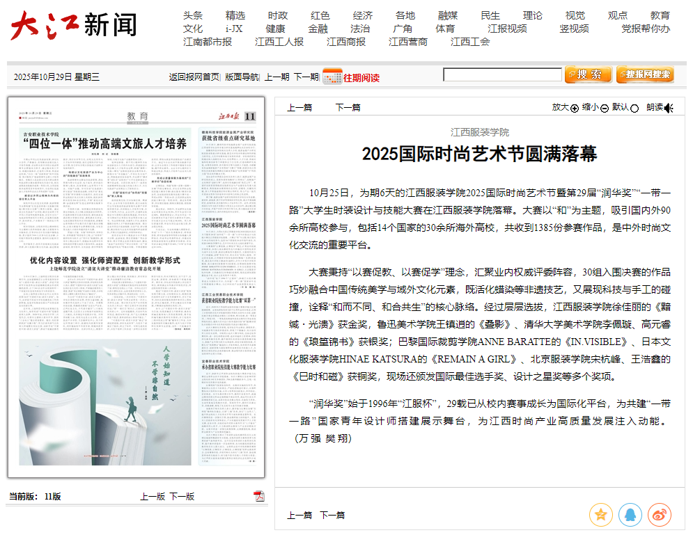 《江西日报》(2025年10月29日 第11版)刊登报道:10月25日,为期6天的江西服装学院2025国际时尚艺术节暨第29届“润华奖”“一带一路”大学生时装设计与技能大赛在江西服装学院落幕。大赛以“和”为主题,吸引国内外90余所高校参与,包括14个国家的30余所海外高校,共收到1385份参赛作品,是中外时尚文化交流的重要平台。