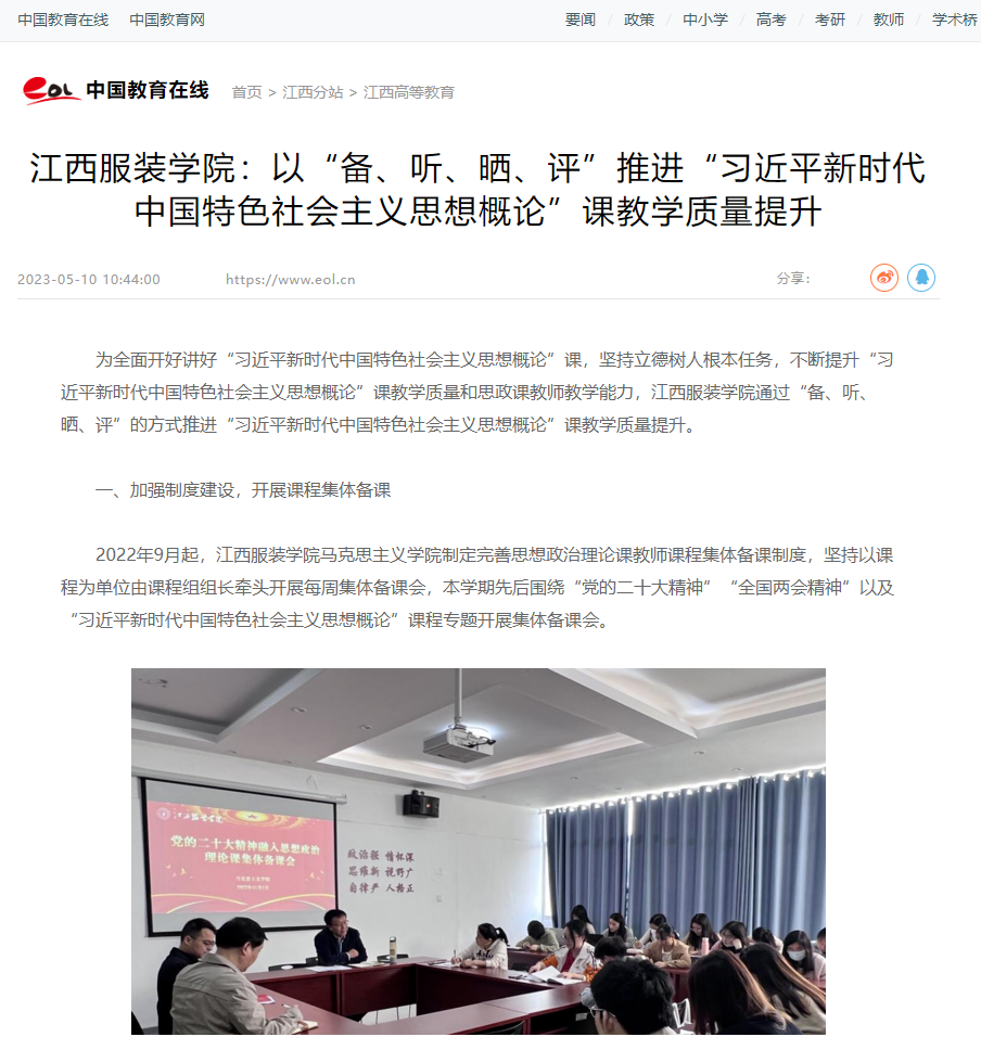 中国教育在线:江西服装学院:以“备、听、晒、评”推进“习近平新时代中国特色社会主义思想概论”课教学质量提升