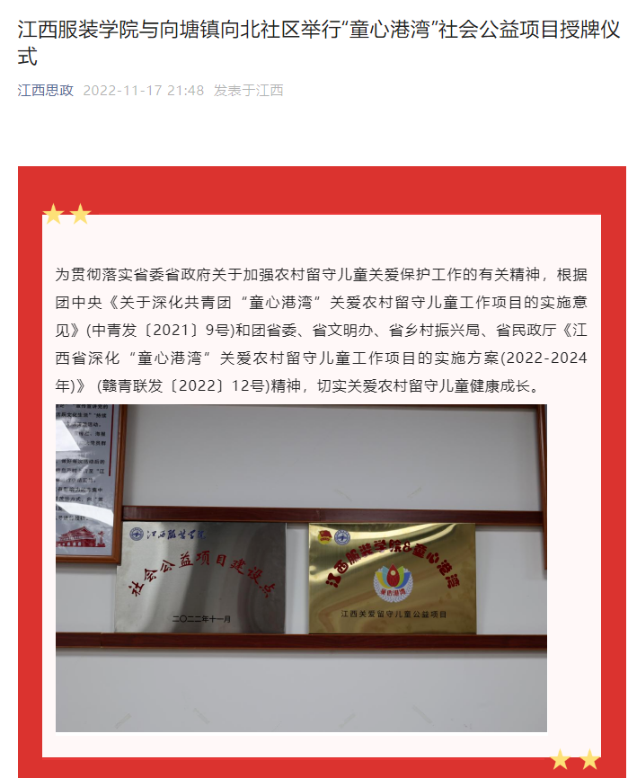 江西思政:江西服装学院与向塘镇向北社区举行“童心港湾”社会公益项目授牌仪式