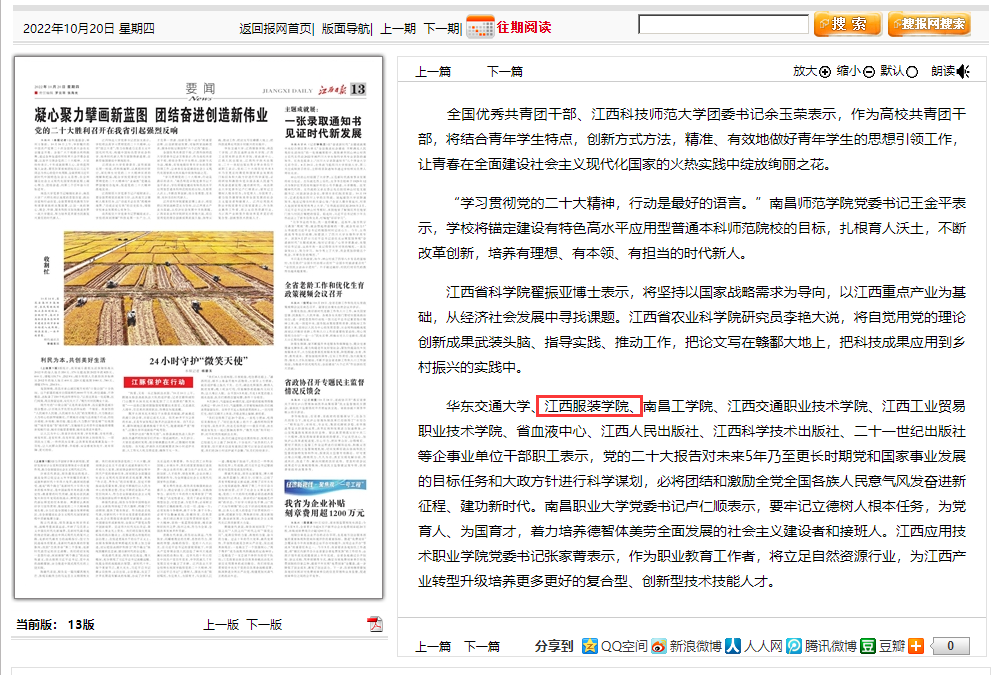 新闻链接:《江西日报》刊登:凝心聚力擘画新蓝图 团结奋进创造新伟业 党的二十大胜利召开在江西服装学院引起强烈反响