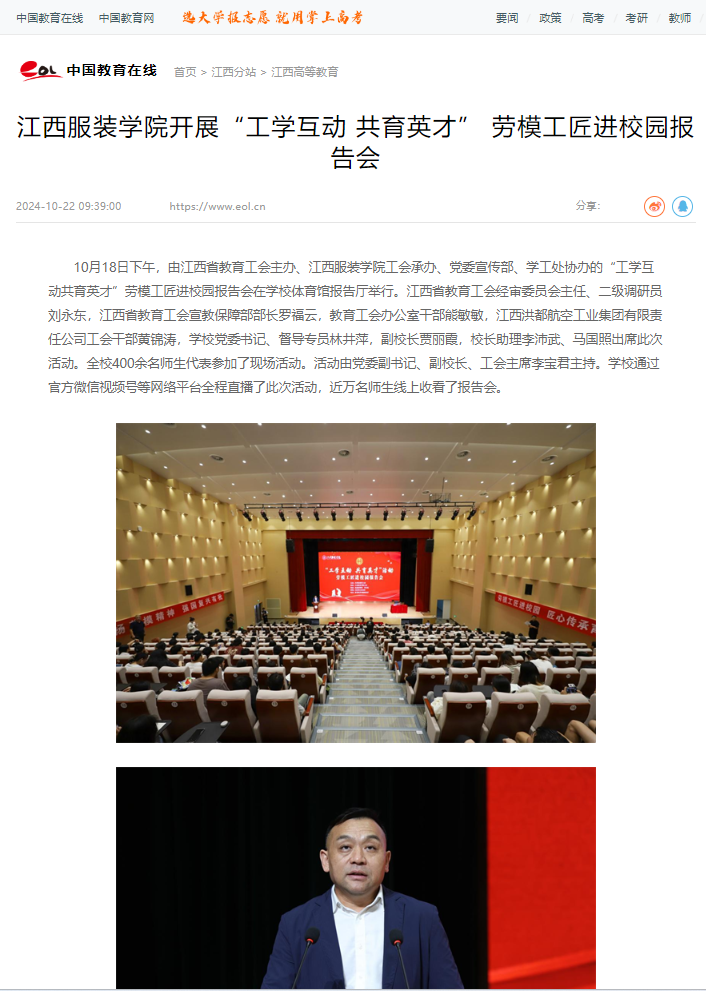 中国教育在线:江西服装学院开展“工学互动 共育英才” 劳模工匠进校园报告会